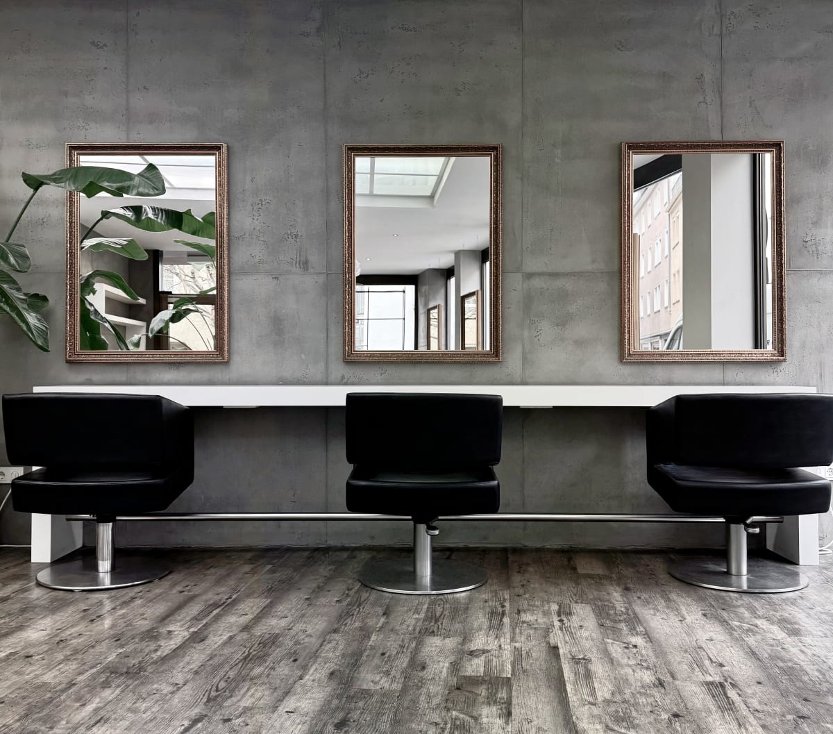 Genießen Sie Ihre Auszeit in unserem stilvollen, grünen Salon mit entspannter Musik und wohltuender Atmosphäre – wir bringen Ihr Haar perfekt zur Geltung.
